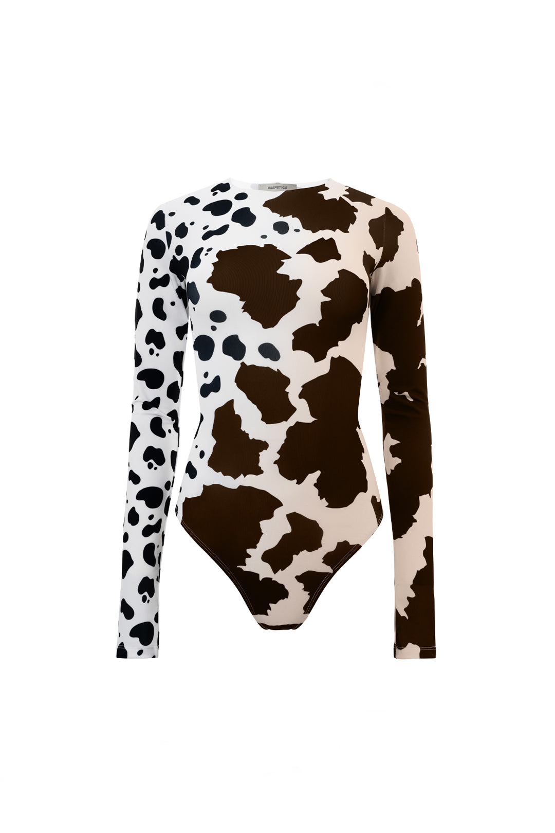 боді furry — обтислий, з довгим рукавом і виразним cow-принтом. виглядає зухвало, сидить щільно, почувається...