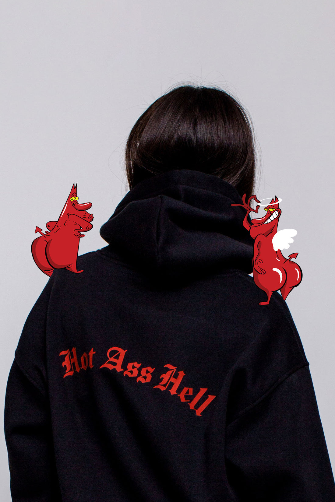 худі "hot ass hell" у чорному базовому кольорі виконане в фасоні oversize і має спущене...