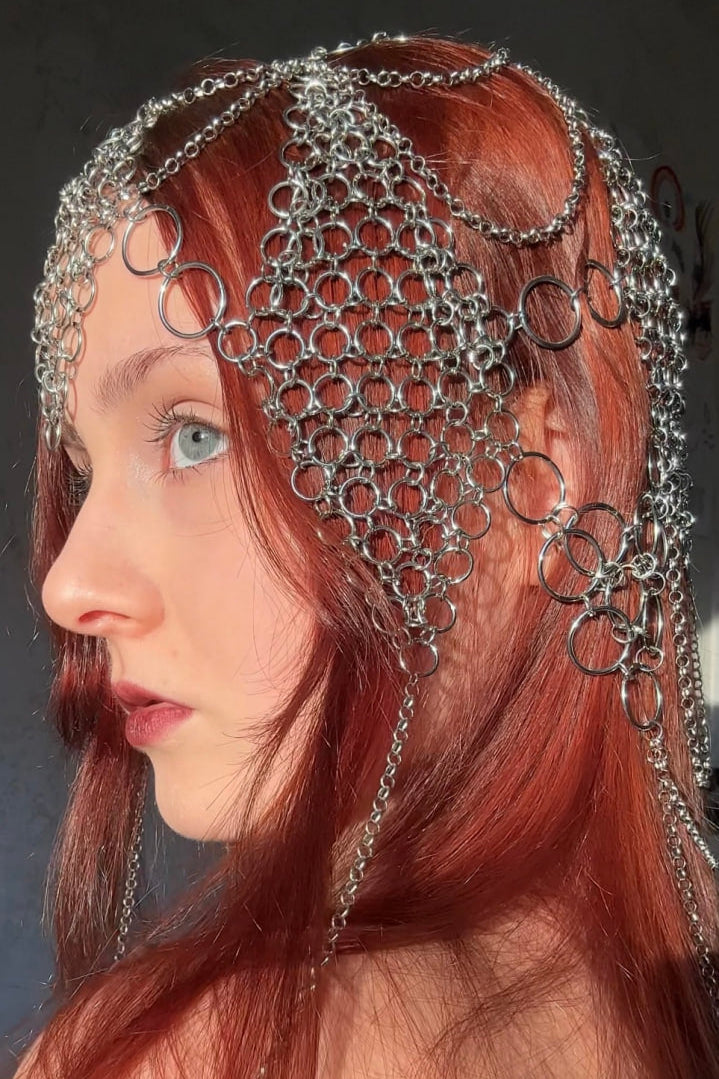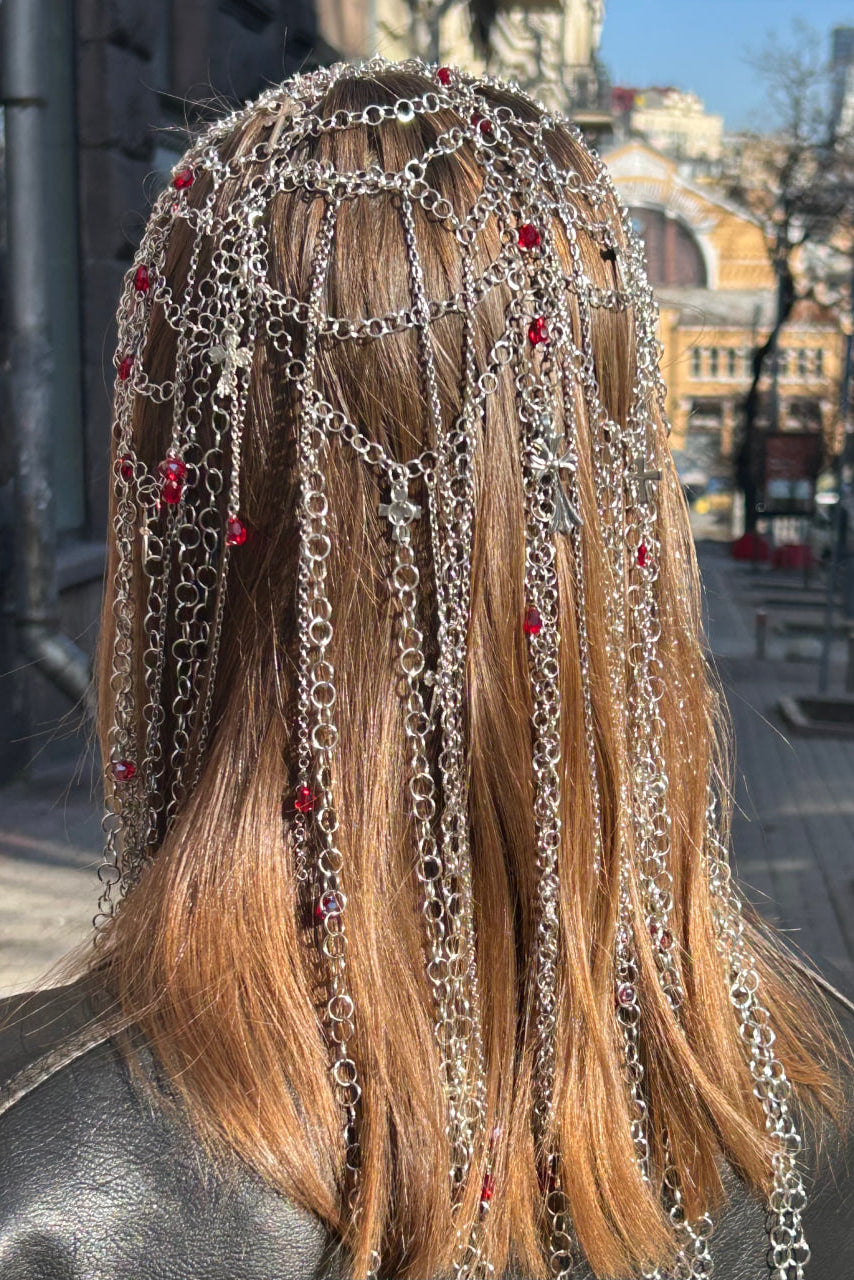 виконана з кілець у вільному плетенні, має форму павутинки, яка плавно стікає по волоссю. до...