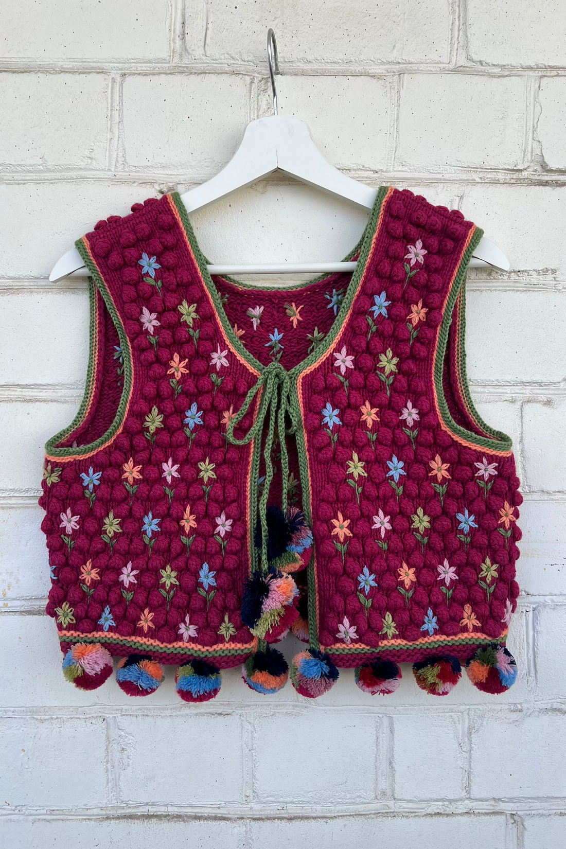 малинова етнічна жилетка з вишивкою та помпонами