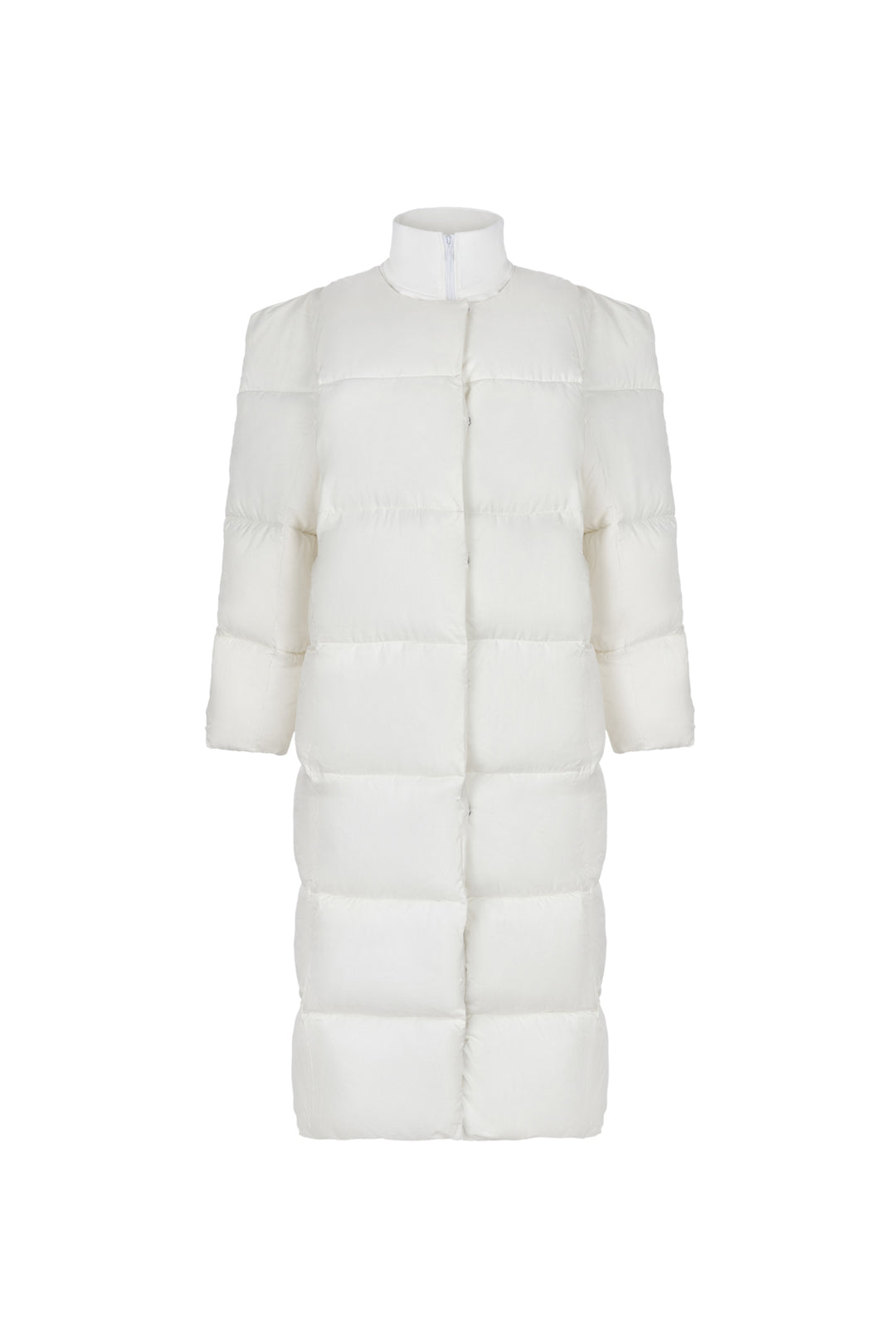 довгий пуховик у молочному кольорі підтримує температуру до -20°C за допомогою утеплювача, манжетам всередині рукава...