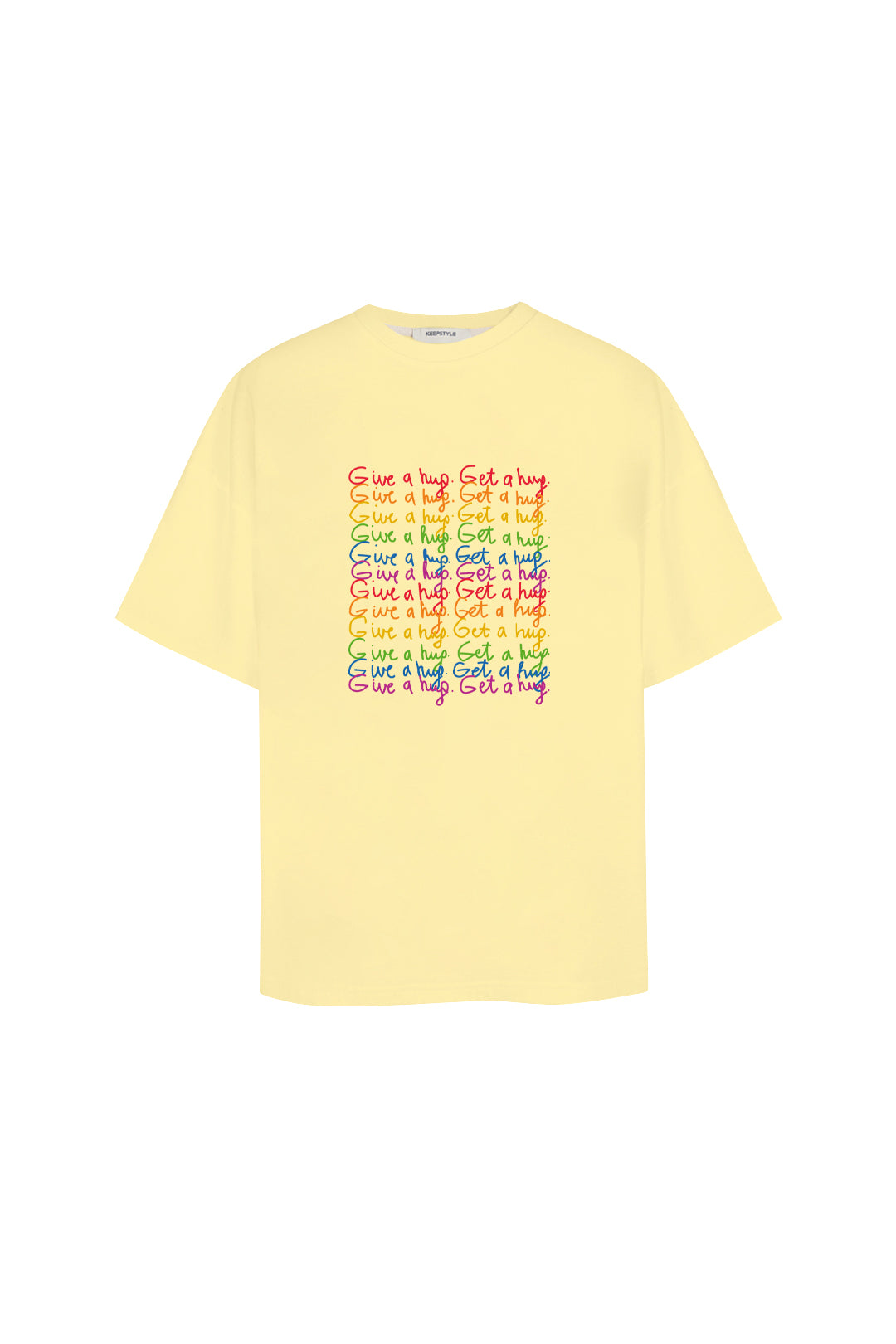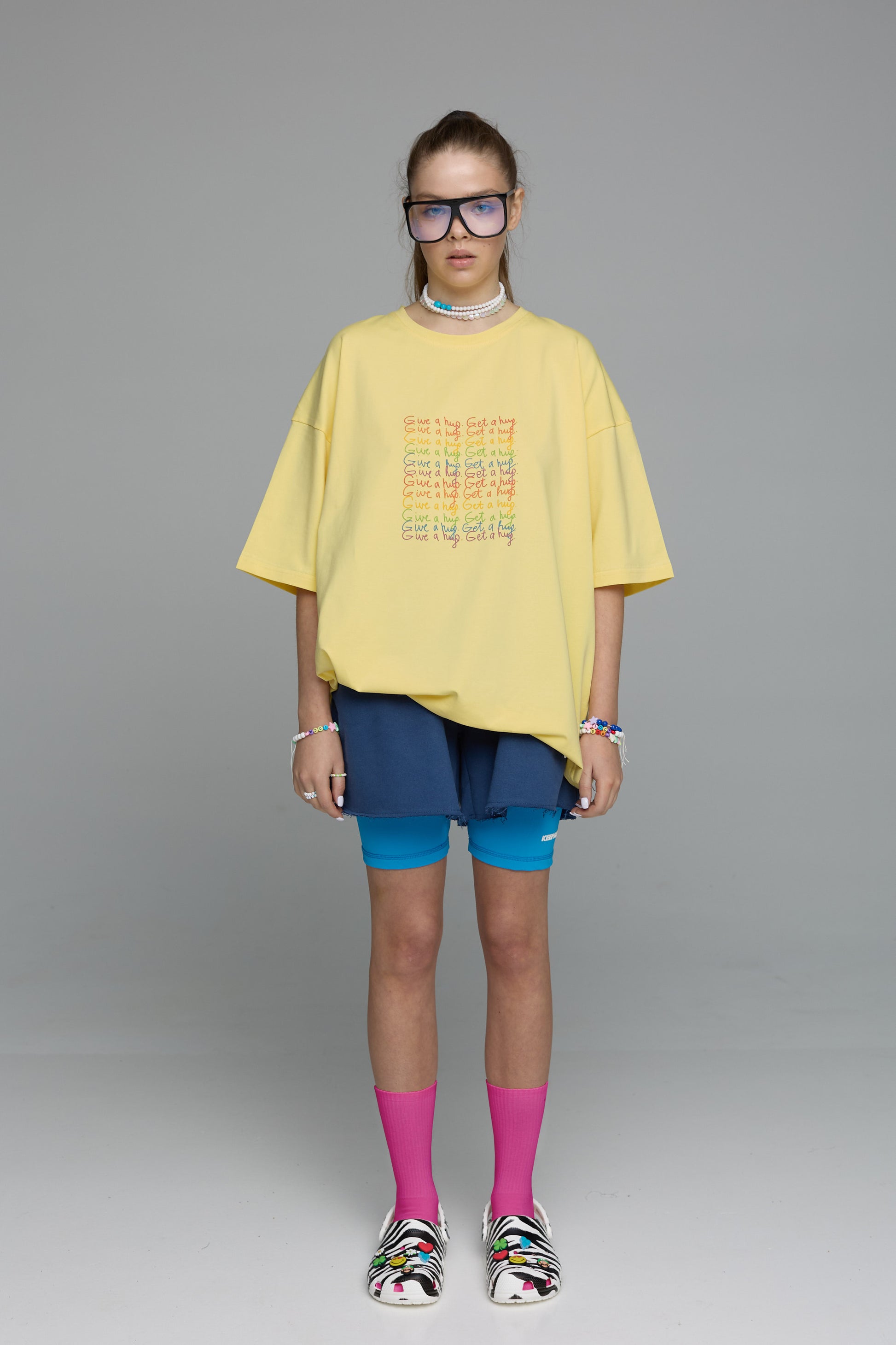 футболка hug у кольорі baby yellow з принтом спереду. футболка виконана у вільному фасоні oversize, тому підійде для активного відпочинку чи занять спортом. ця базова футболка ідеально комбінується з повсякденними речами гардероба, як джинси, шорти, легінси, спідниці й спортивні костюми