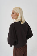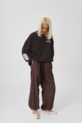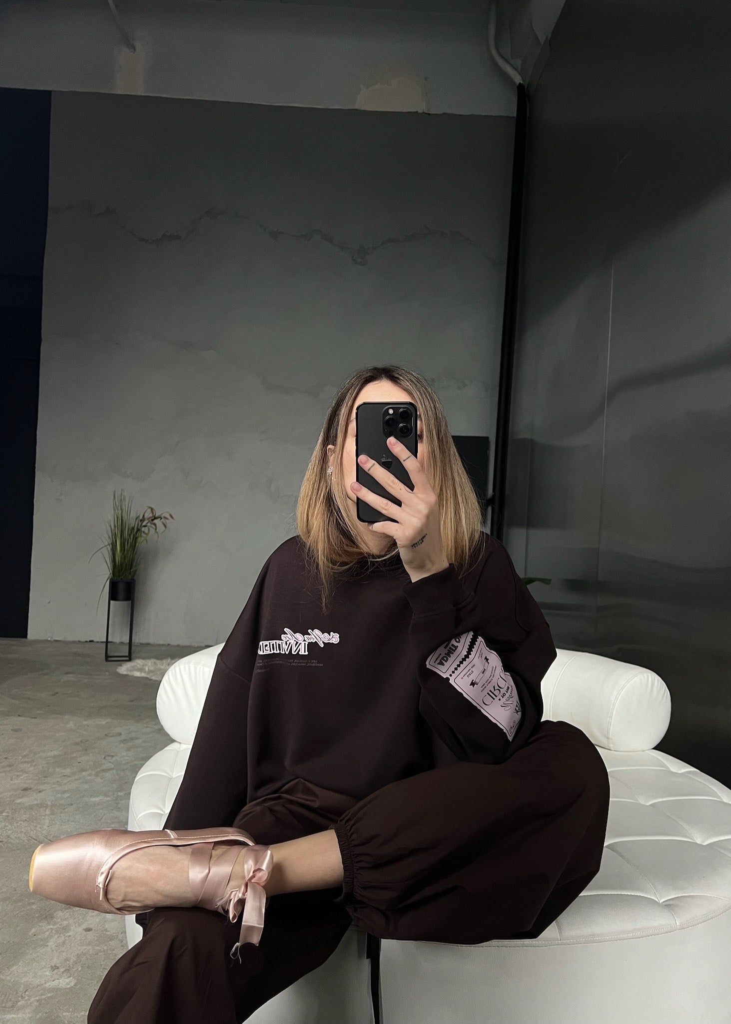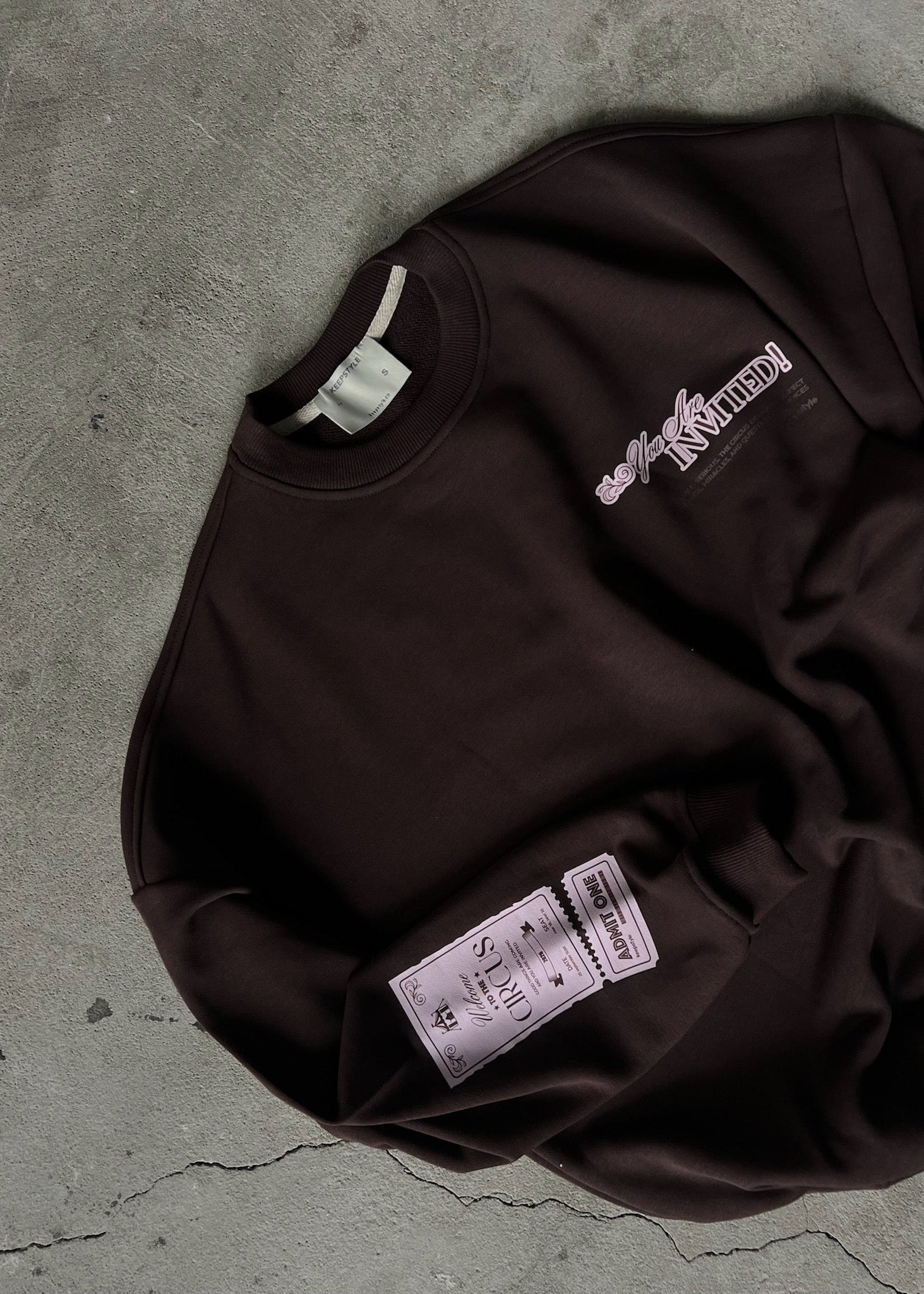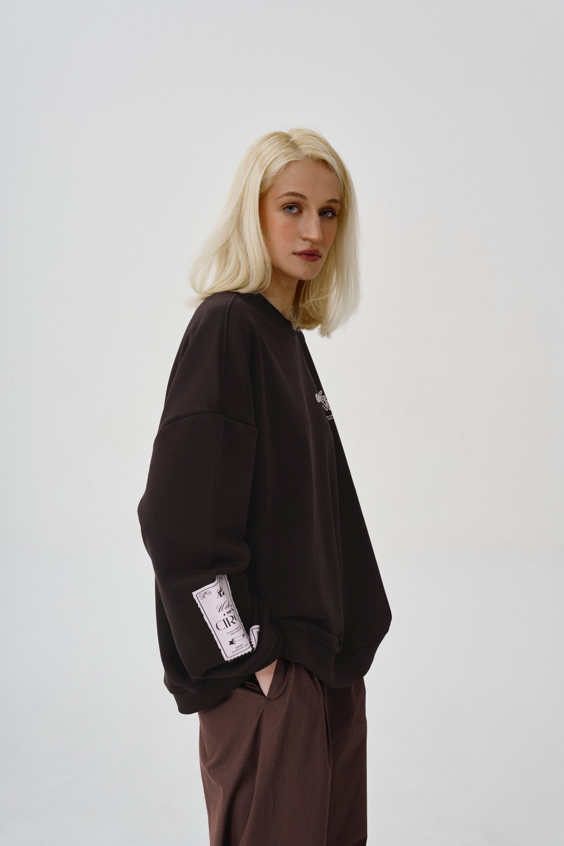 світшот у коричневому базовому кольорі виконаний в фасоні oversize і має спущене плече. в світшоті присутні декоративні елементи — принт зпереду та квиток до цирку на рукаві