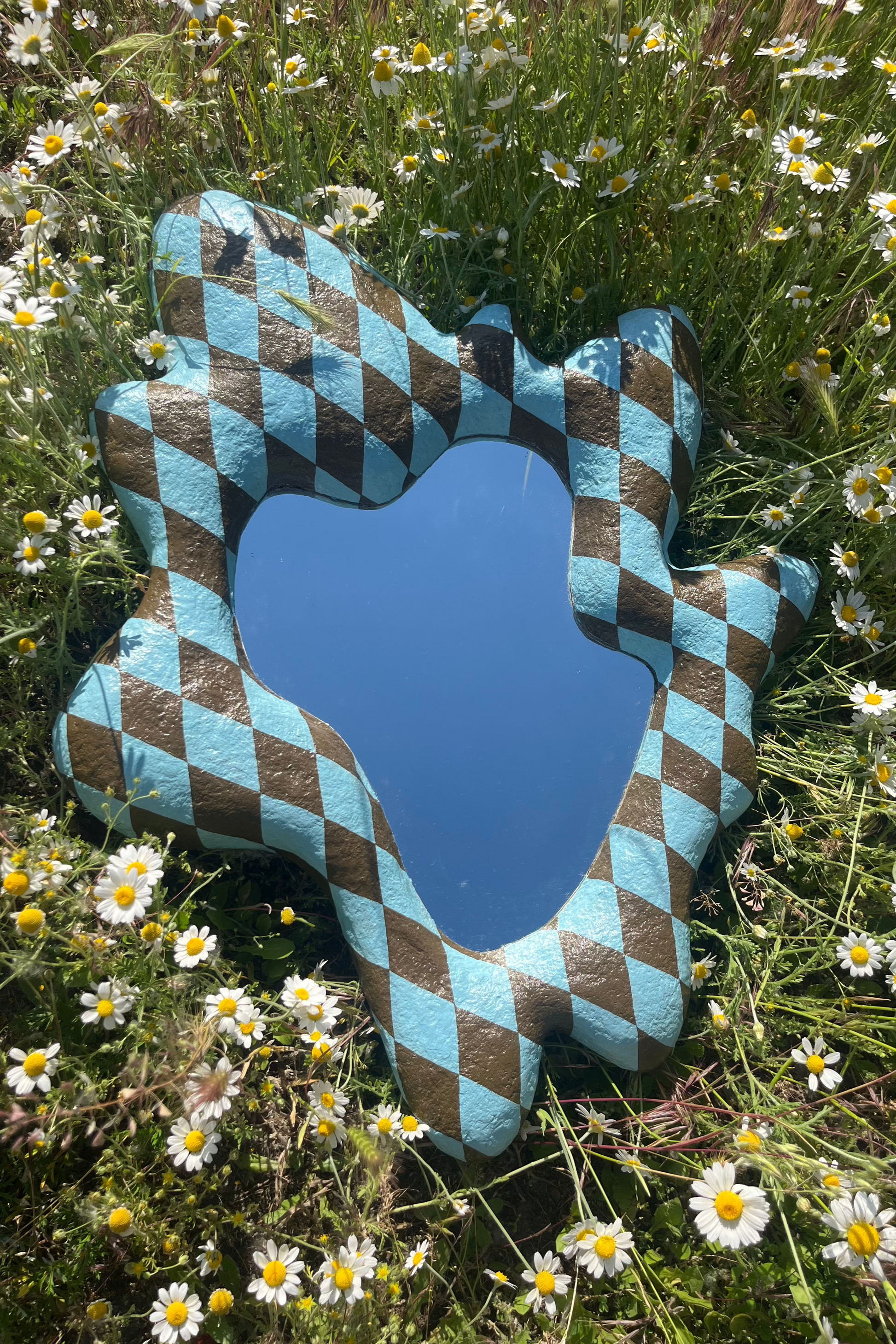 дзеркало з принтом ромби у блакитно-коричневому кольорі виконано в техніці папьємаше, легке і водночас міцне