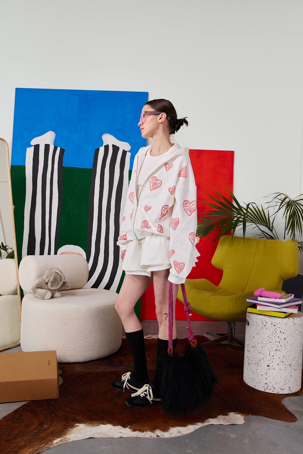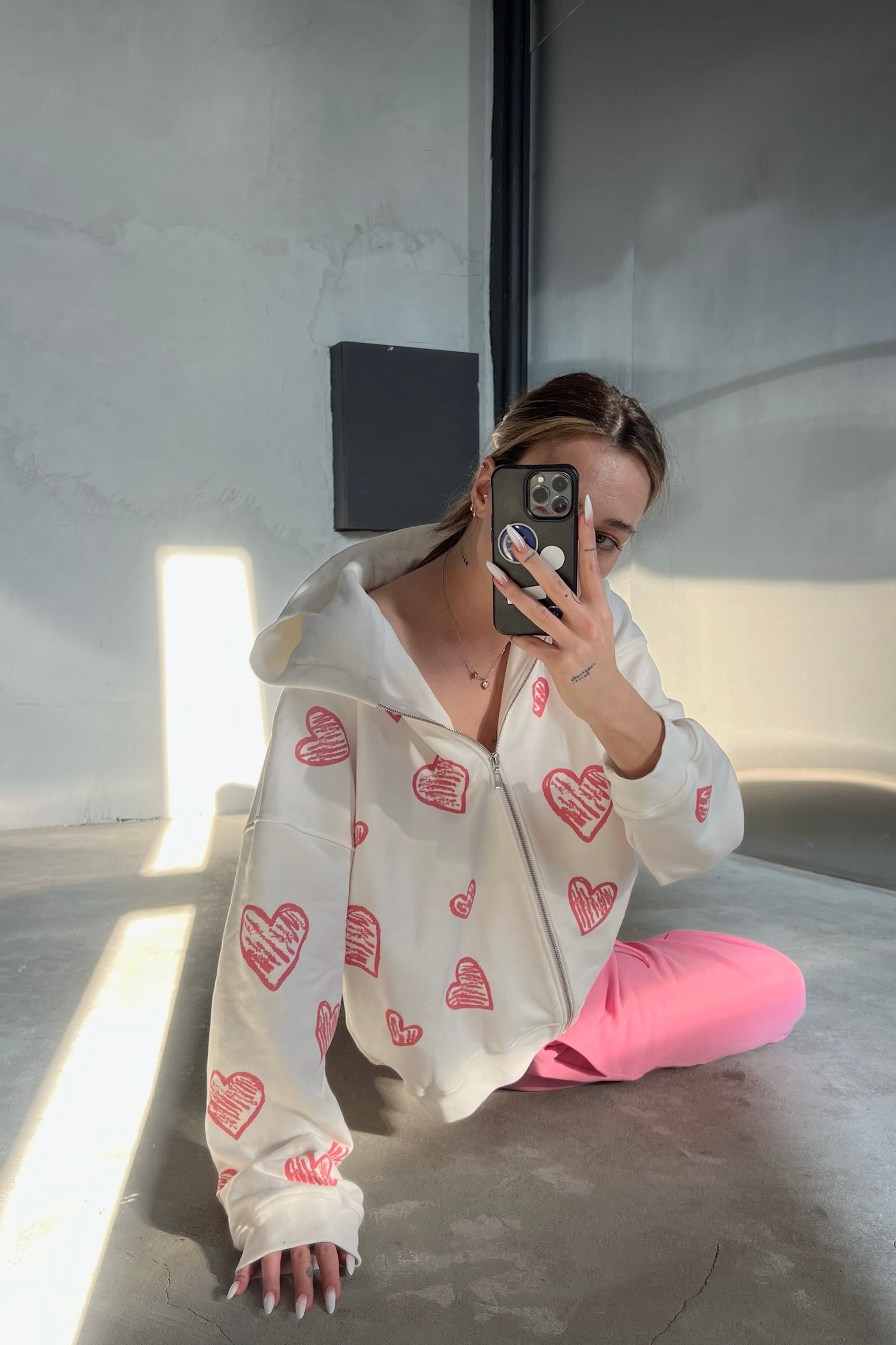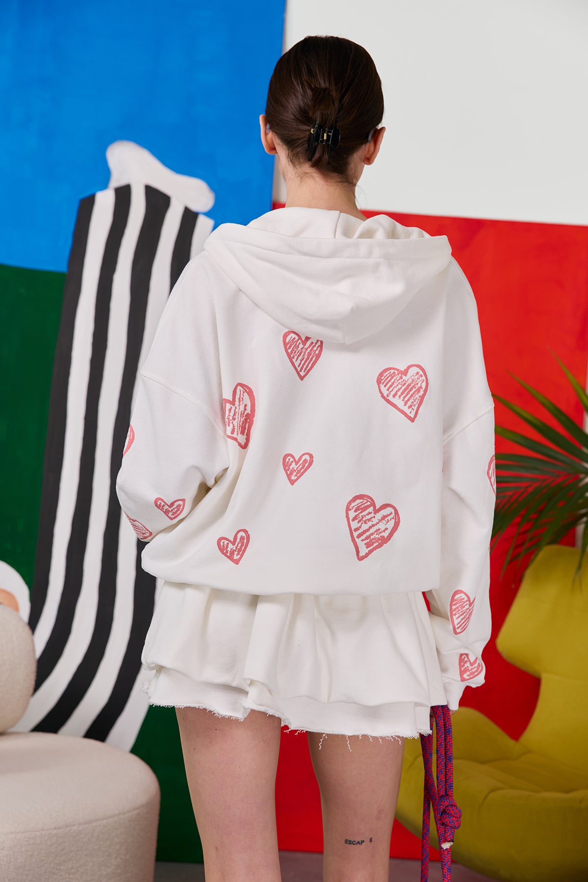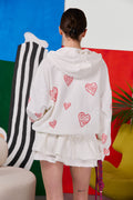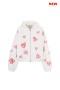 зіпер з капсули "love intention" у молочному кольорі, з відповідним романтичним принтом сердеться на всю модель. він легко комбінується з шортами destroyed або штанами real big, бо є базовим предметом колекції