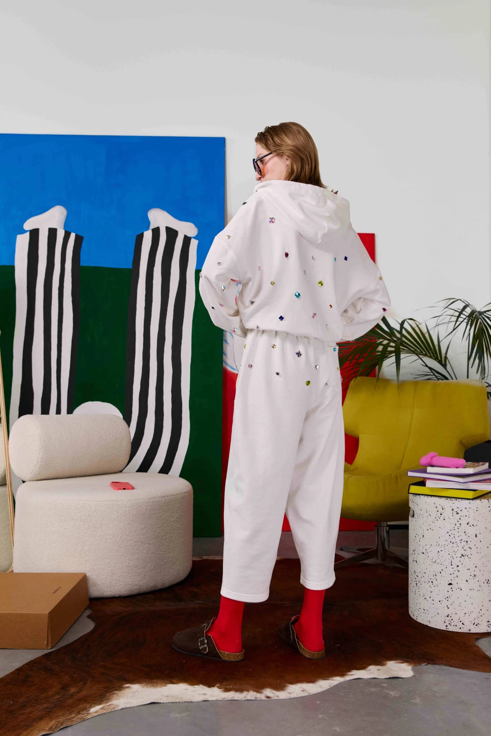 штани balloon у кольорі cloud — вільного фасону з м'яким об'ємом у стегнах і легким звучанням донизу. прикрашені розсипом декоративного каміння, кожен елемент наштий вручну, тому кожна пара унікальна