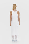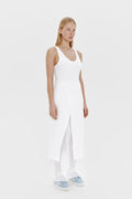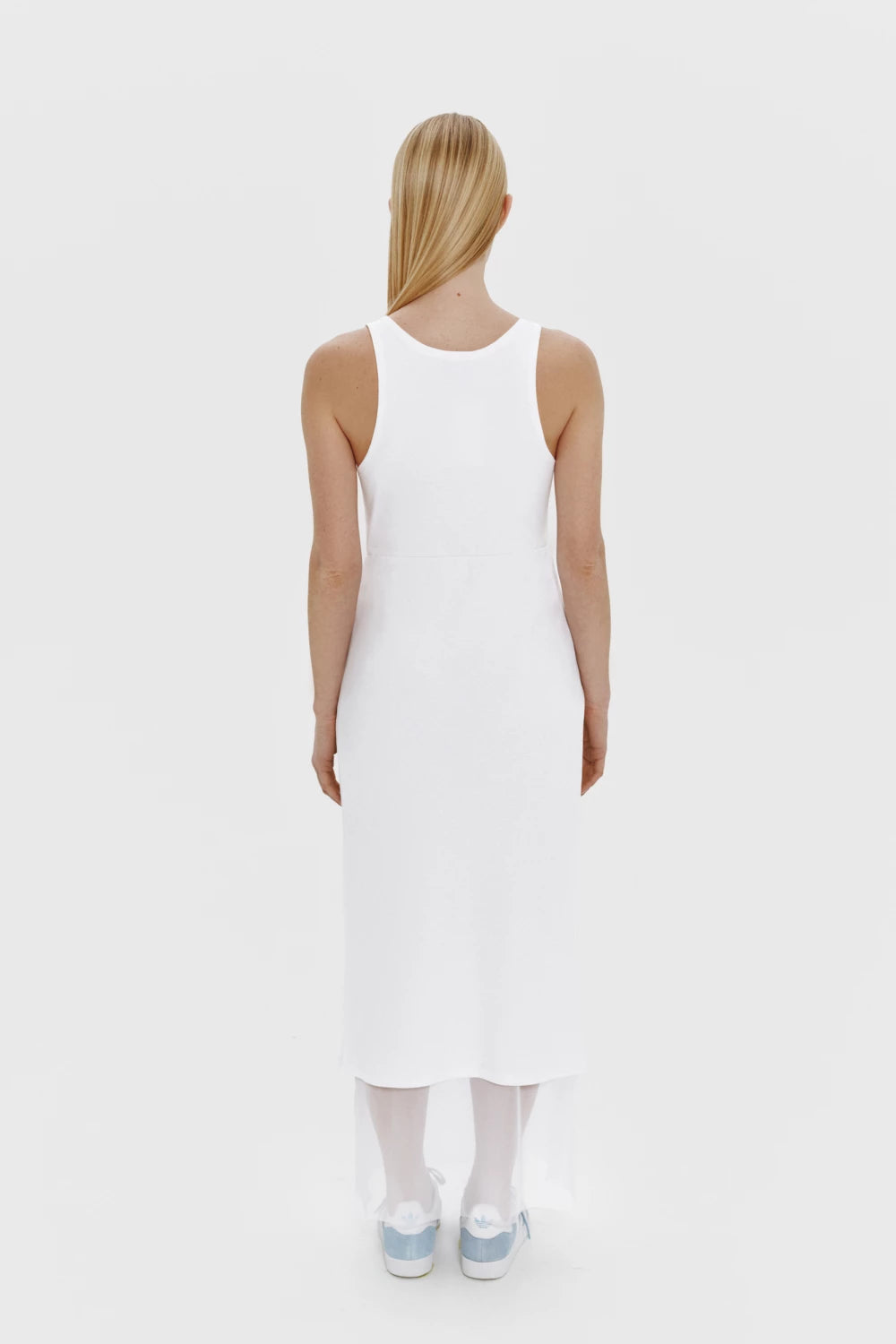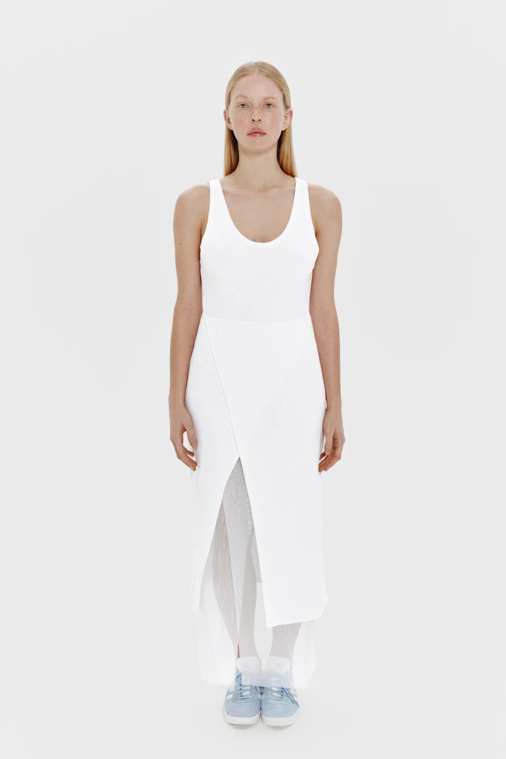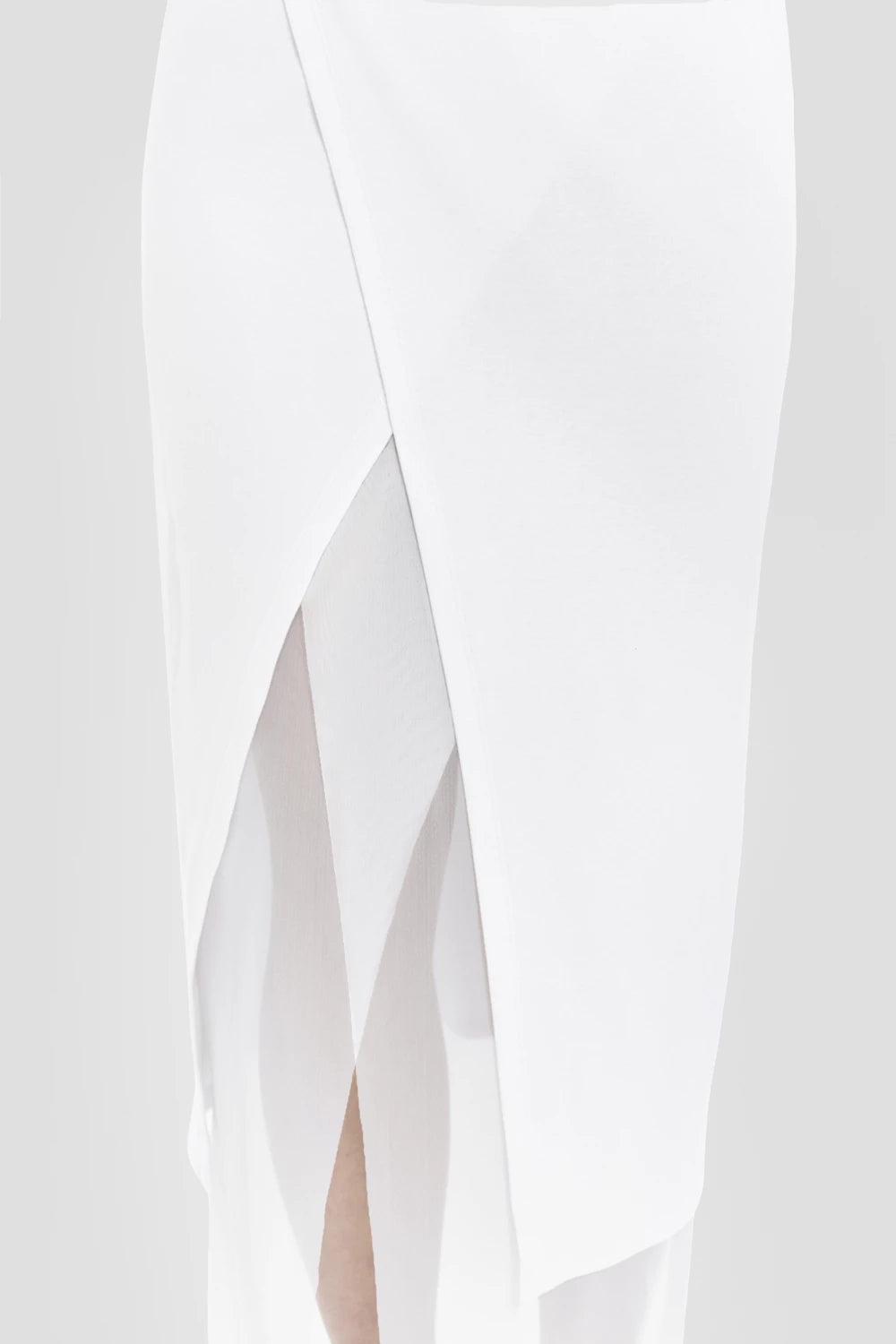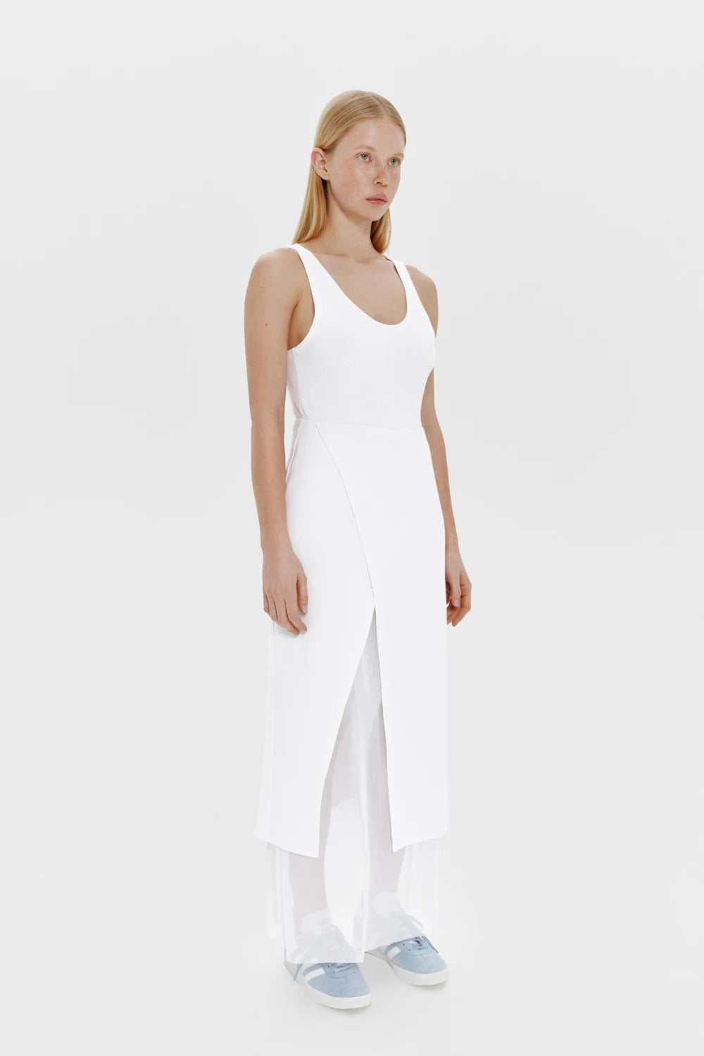 cукня "petals" у білому кольорі з колекції WOMAN, яка не потребує додаткової стилізації, ми створили сукню максі з розрізом вищої коліни, і додали декоративний елемент у вигляді ситки, яка додає ніжності та легкості до форми