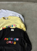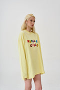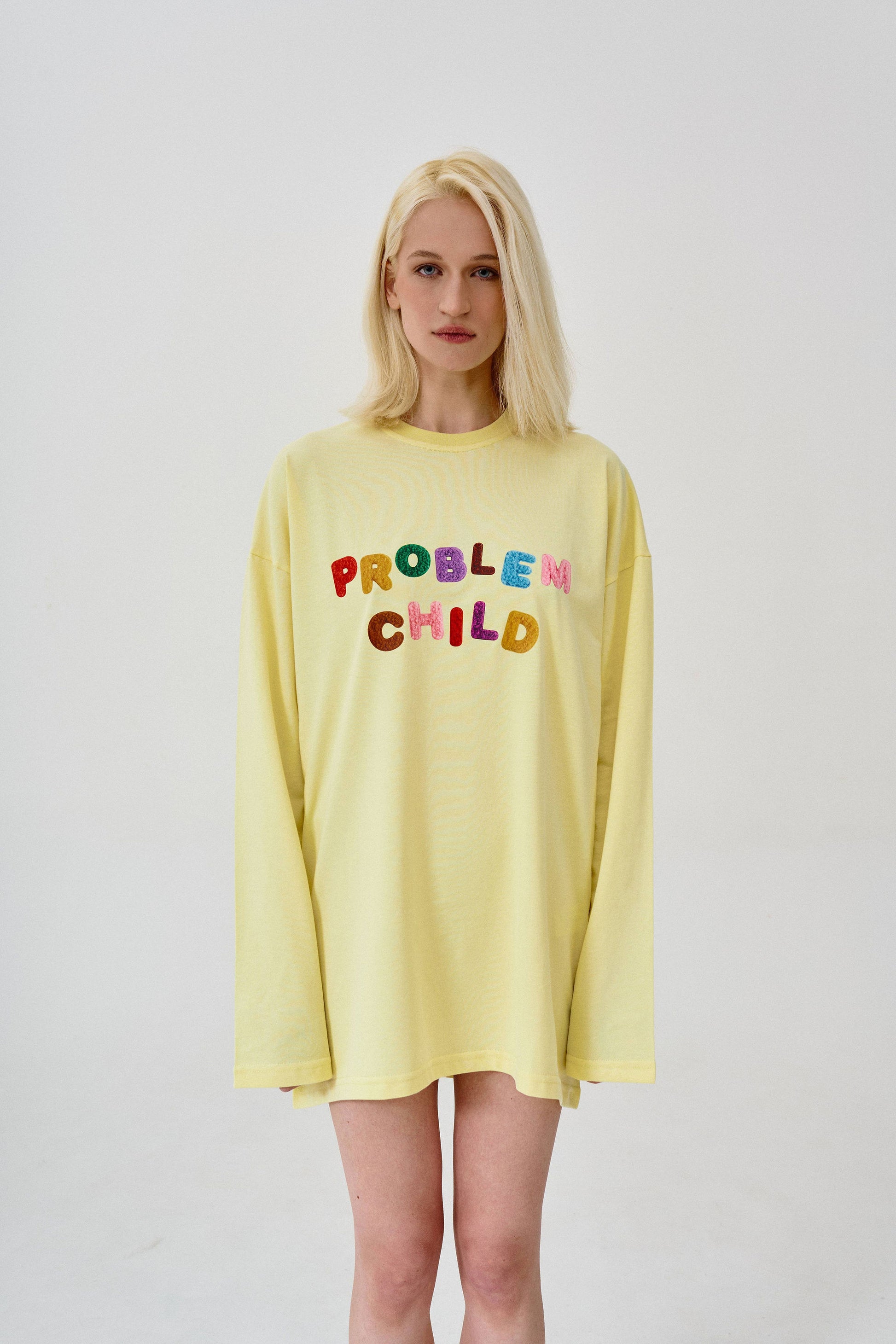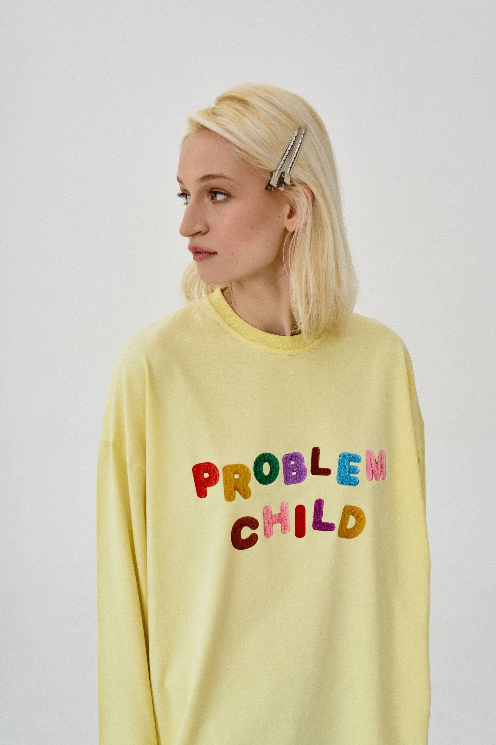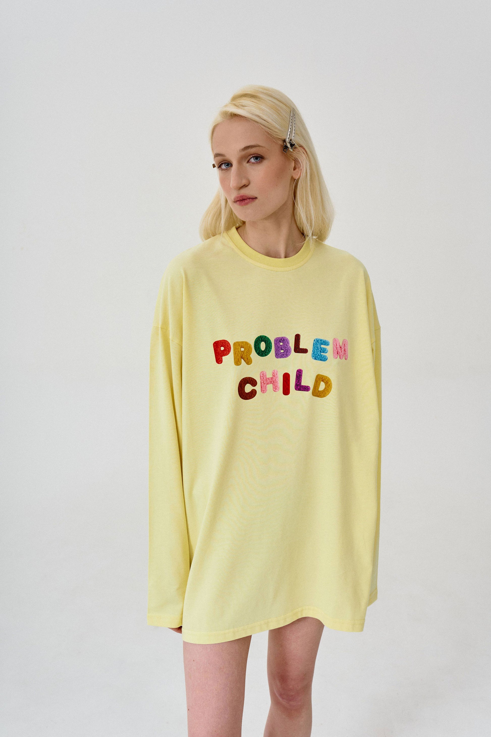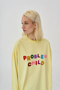 лонгслів "Problem child" у baby yellow кольорі із яскравим принтом спереду. вільний фасон та спущена лінія плеча роблять цей лонгслів суперкомфортним для повсякденного носіння