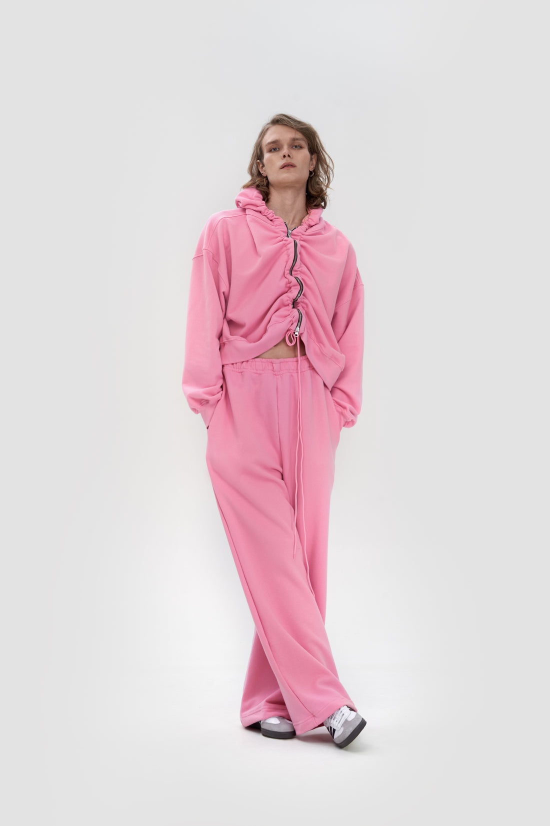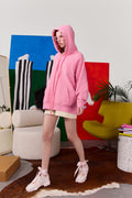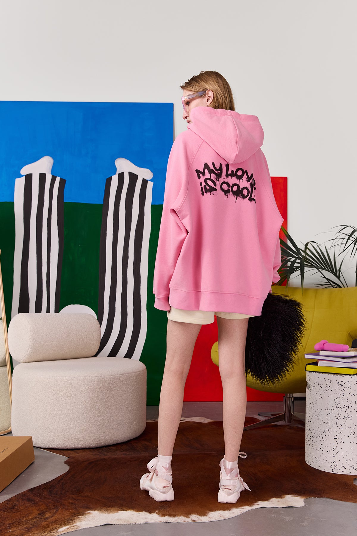 худі "my love is cool" у кольорі bubble з однієї колекції. воно виконане у фасоні oversize з рукавом реглан. в худі присутні декоративні елементи - шнурки, які зроблені з основного матеріалу виробу, кишеня переду, в якому достатньо місця для рук і дрібних речей, і друк на спині, що імітує надпис балончиком, наче графіті - моє кохання це круто.