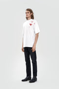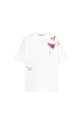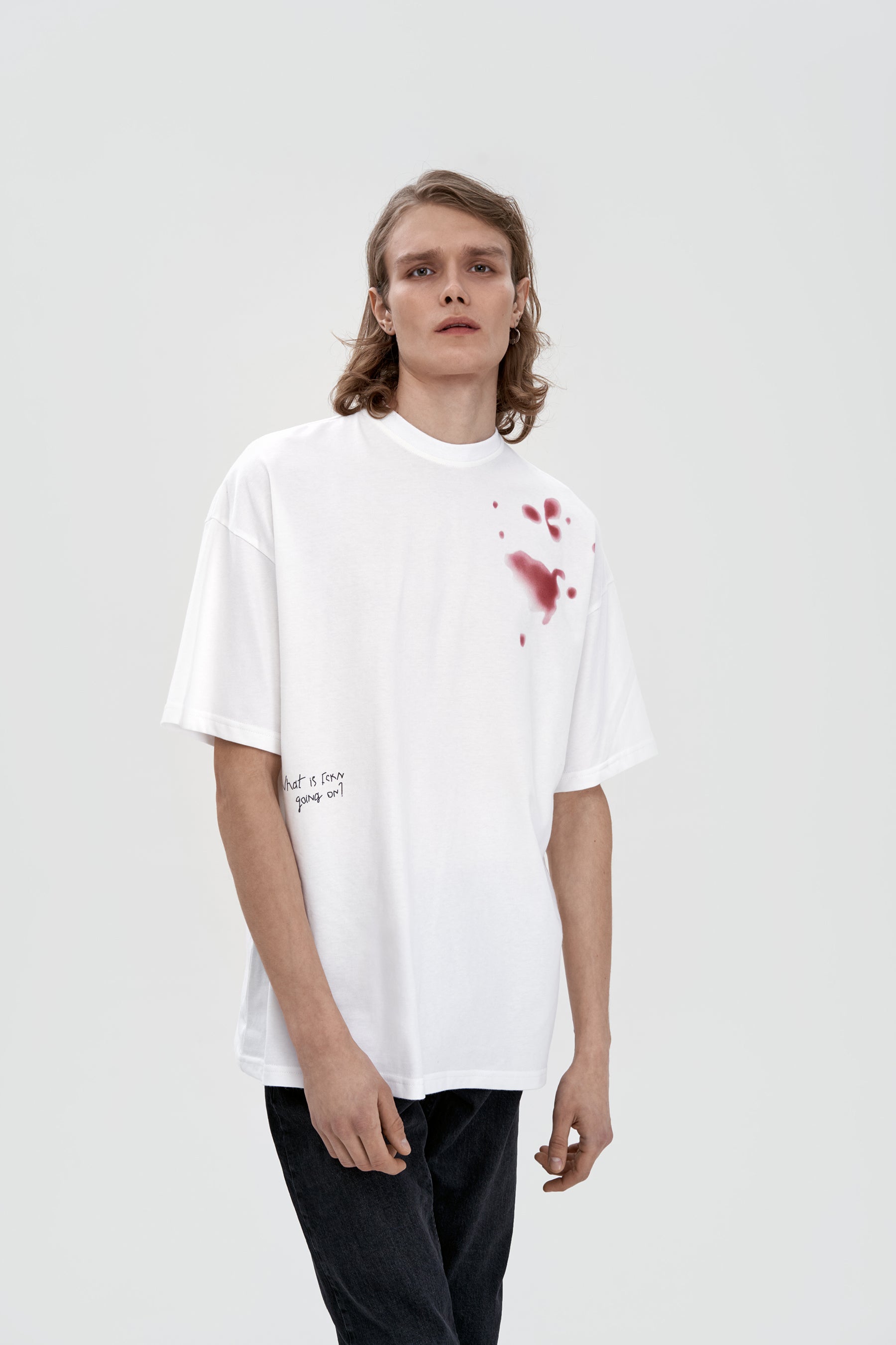 футболка у білому кольорі має принт плям, що імітують розлите на футболку червоне вино або вишневий сік, думаємо, що це краще вирішувати вам. знизу виробу розташований надпис з вічним питанням. футболка виконана в фасоні oversize і має спущене плече